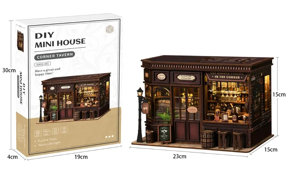 In Corner Tavern Mini House, you can find wooden-framed glass door, retro lamppost, miniatures signboard, mini wine and liquor bottles display on the wooden shelves, creating an old-world pub vibes.