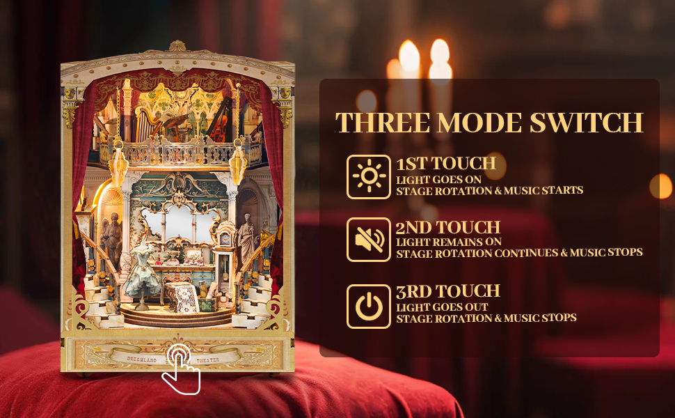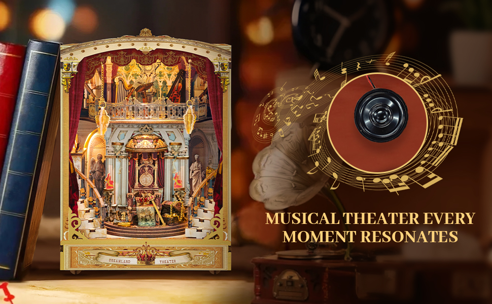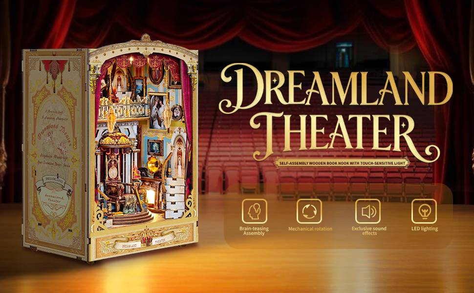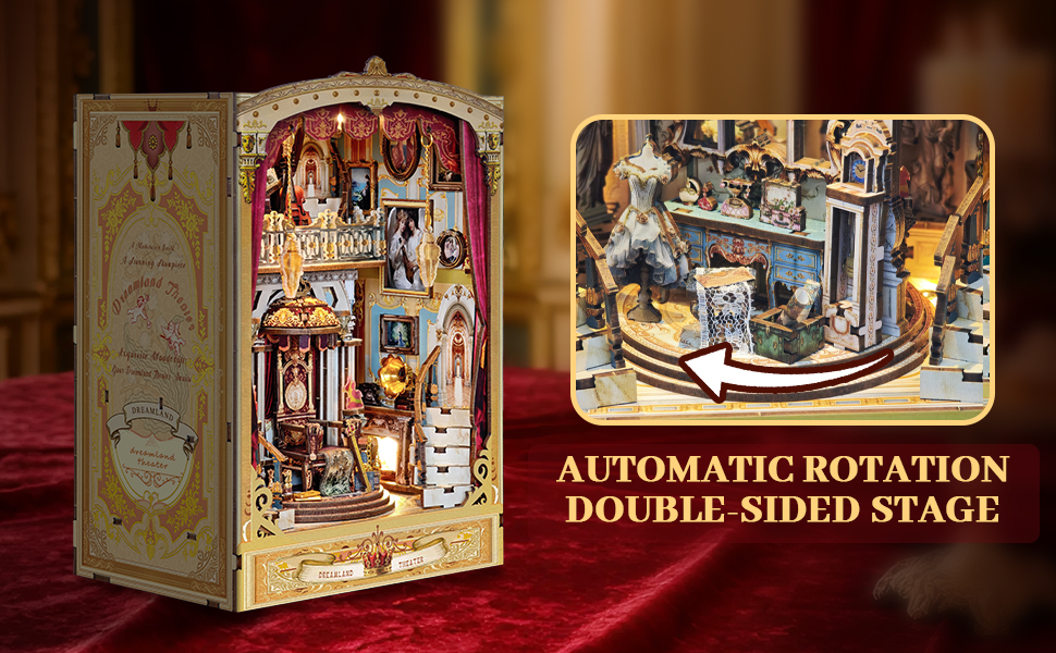 The Dreamland Theater DIY Book Nook Kit is an enchanting miniature stage set inspired by classic opera-house grandeur, featuring ornate interiors, golden décor, and beautifully detailed performance scenes. For to this premium kit includes a three-mode switch that lets you choose between warm ambient lighting, dynamic stage lighting, or fully animated showcase mode. Its standout feature is the automatic rotation double-sided stage, which smoothly turns to reveal two completely different theatrical scenes—doubling the storytelling charm within the same nook.