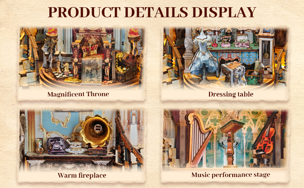 • Miniature Props With High Detail: Features like the gramophone, violin, harp, candelabras, costumes, and stage furniture create a lifelike, immersive atmosphere.