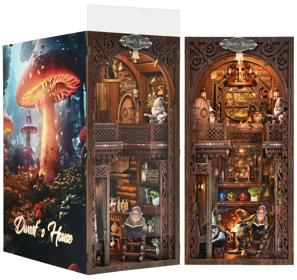 The Dwarf's House DIY Book Nook Kit is a charming miniature scene that brings you to life a cozy, magical dwelling straight out of a fantasy tale. Each section of the nook reveals delightful details — from a bearded dwarf painting at his tiny easel to warm wooden interiors filled with intricate furniture, books, and glowing lanterns. From the arched doors, rustic shelves, and whimsical décor create an enchanting sense of depth, making it feel like you’ve stepped into a hidden world tucked between the pages of a storybook.