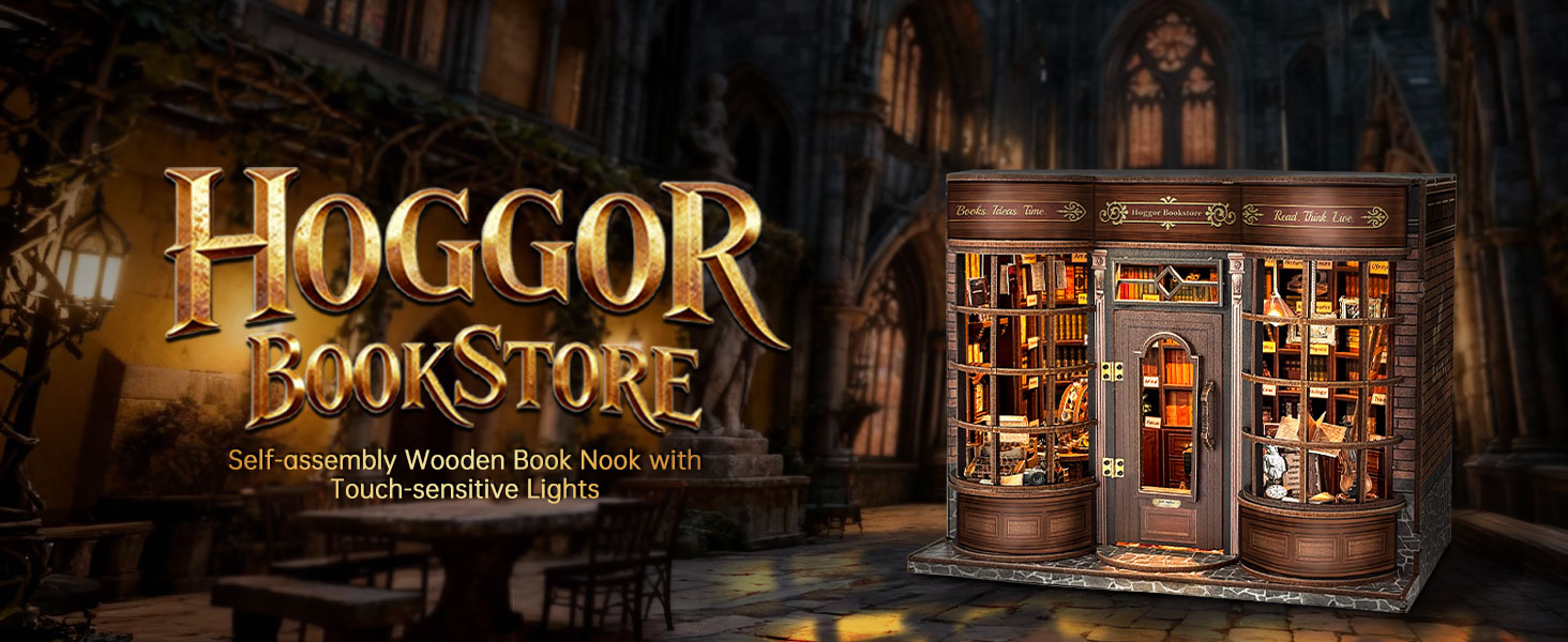 The Hoggor Bookstore DIY Miniature Kit recreates the warm, scholarly charm of an old-world bookstore, where towering shelves brim with carefully categorized volumes and quiet knowledge fills the air. An exquisite reading desk sits at the heart of the scene, complete with tiny books, scrolls, and a teacup that suggest hours of thoughtful reading. The book-hunting corner invites curious minds to explore subjects from poetry to science, while the classic display shelves showcase beautifully bound editions and timeless details. Soft, ambient lighting and rich wooden textures bring the miniature library to life, making it a peaceful literary retreat perfect for display on your desk or mantelpiece.