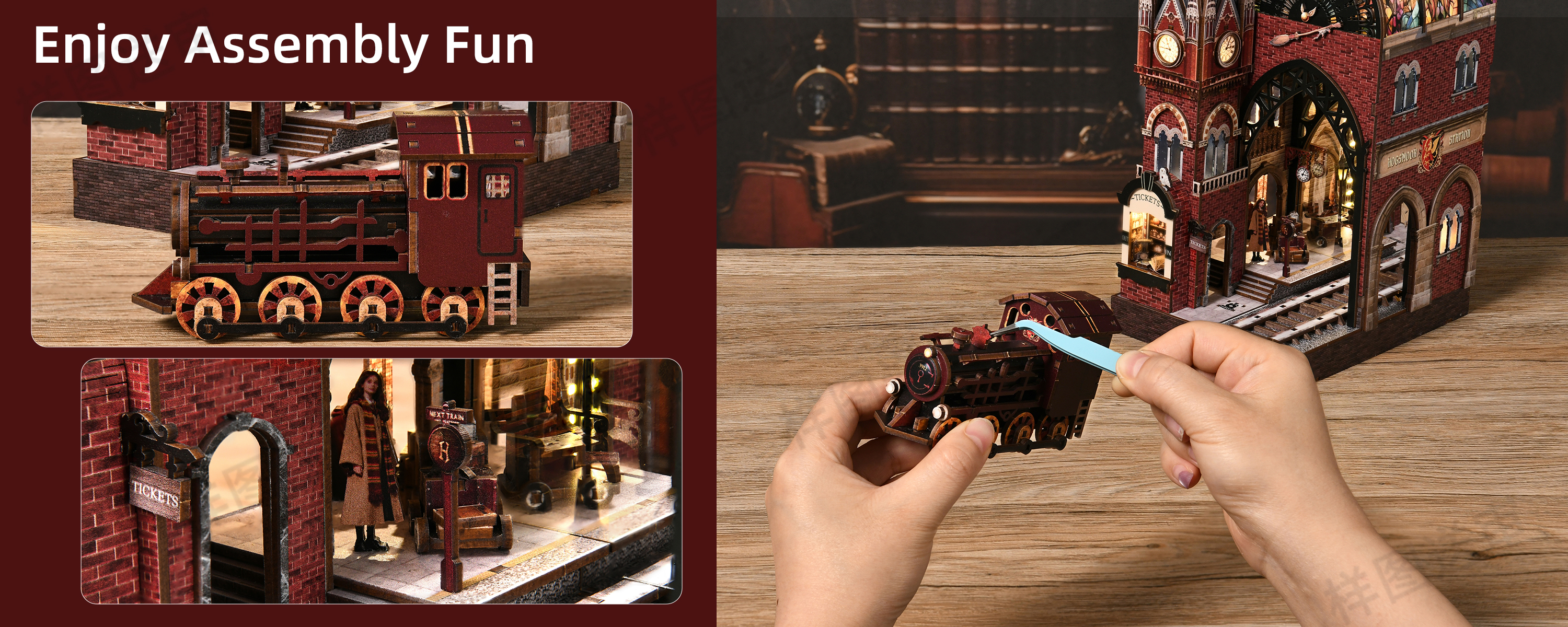 Designed with authentic Victorian details—textured red-brick walls, elegant arched windows, and a clock tower reminiscent of historic London stations. Every piece evokes the grandeur of a bygone era, blending nostalgia with fantasy.