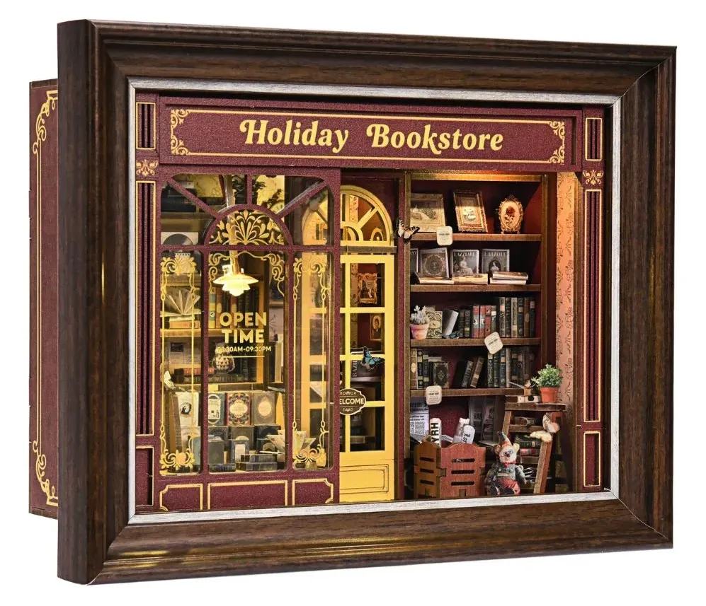 The Holiday Bookstore DIY Book Nook Kit captures with to the warm charm of a cozy vintage bookshop, complete to with golden window frames, classic wooden shelves, and an inviting front door that feels ready to open into a world of stories. Inside, every corner is filled with miniature treasures—stacked books, framed art, antique clocks, tiny radios, potted plants, and charming décor that create the perfect nostalgic atmosphere of a quiet holiday afternoon spent browsing timeless tales. This beautifully layered nook turns any bookshelf into a delightful little literary escape.
