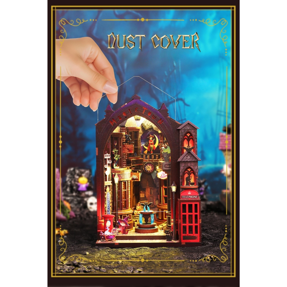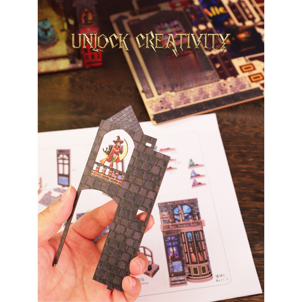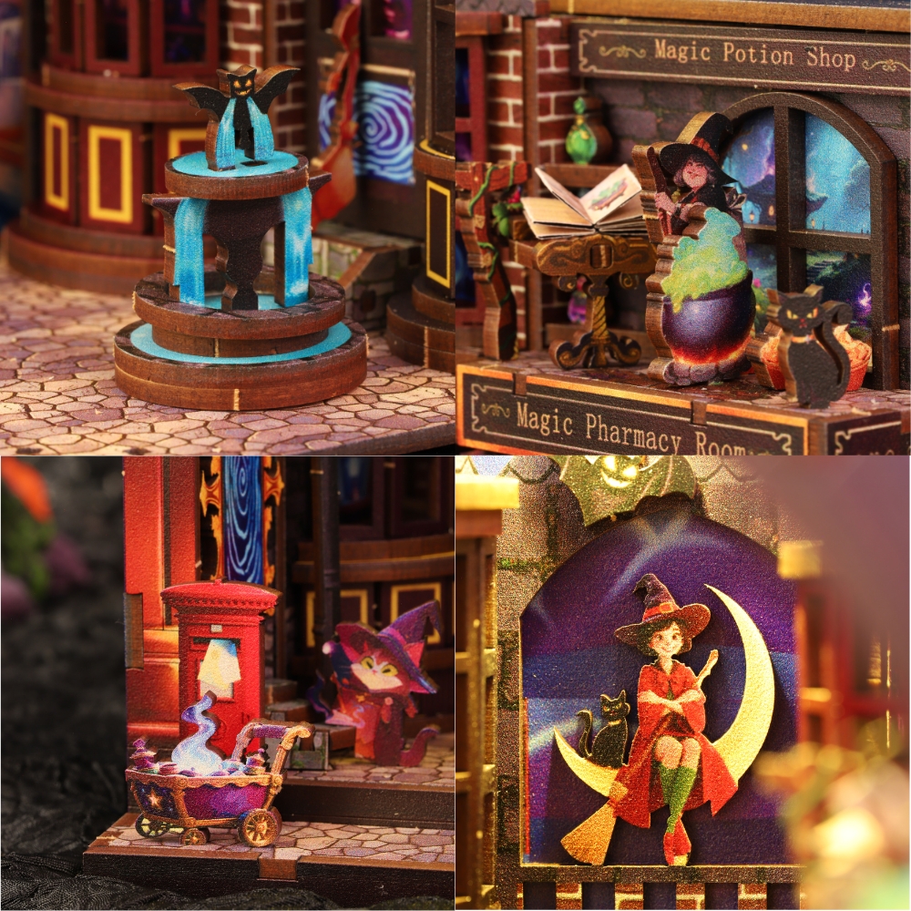 The Magic Alley Book Nook Kit want you away into a whimsical world where witches brew potions and black cats guard secret doors under the shimmer of enchanted light. Every corner of this miniature alley bursts with life — from the bubbling cauldron in the Magic Potion Shop to the glowing fountain watched over by a tiny bat statue. Lanterns flicker along cobblestone paths, spell books lie open mid-incantation, and a witch in red sits gracefully on a crescent moon, her feline companion by her side. Filled with warm colors, intricate textures, and bewitching charm, this nook transforms your bookshelf into a magical midnight street where wonder never sleeps. Why you waiting for...