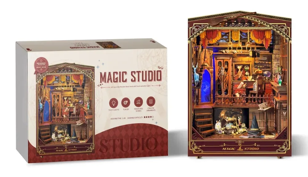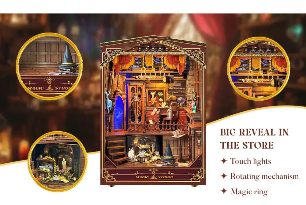 Let's together step into a world of mystery and enchantment with the Magic Studio Book Nook Kit, for where every corner whispers secrets of ancient spells and glowing potions. Inside this spellbinding workshop, shelves brim with crystal balls, wizard hats, and potion bottles that sparkle under touch-activated lights. The rotating mechanism brings movement to the scene—like magic unfolding before your eyes—while the intricate “magic ring” adds an extra layer of wonder. With its rich wooden textures, theatrical curtains, and glowing ambiance, this miniature nook feels like peeking into a sorcerer’s hidden study, where creativity and curiosity dance together in every detail. You willl like it...