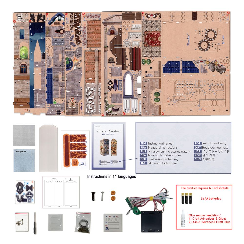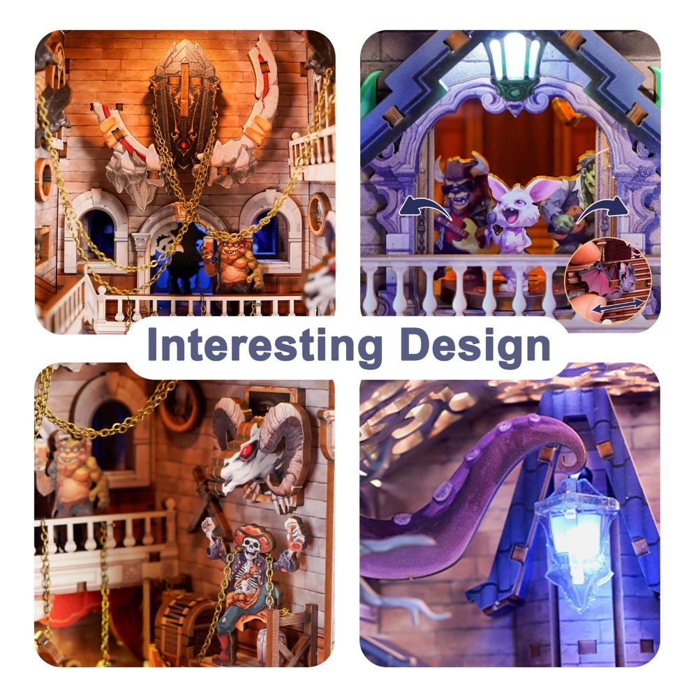 The Monster Carnival DIY Book Nook Kit transforms your bookshelf into a thrilling fantasy world filled with eerie creatures, glowing magical props, and dramatic carnival-style architecture. From chained monsters and skeletal decorations to vibrant stage curtains and swirling tentacles illuminated by mystical blue light, every corner is packed with bold, eye-catching details. This kit creates an immersive, spooky-yet-playful scene that feels like stepping into a mysterious carnival of monsters—perfect for builders who love dark fantasy and striking visual displays.