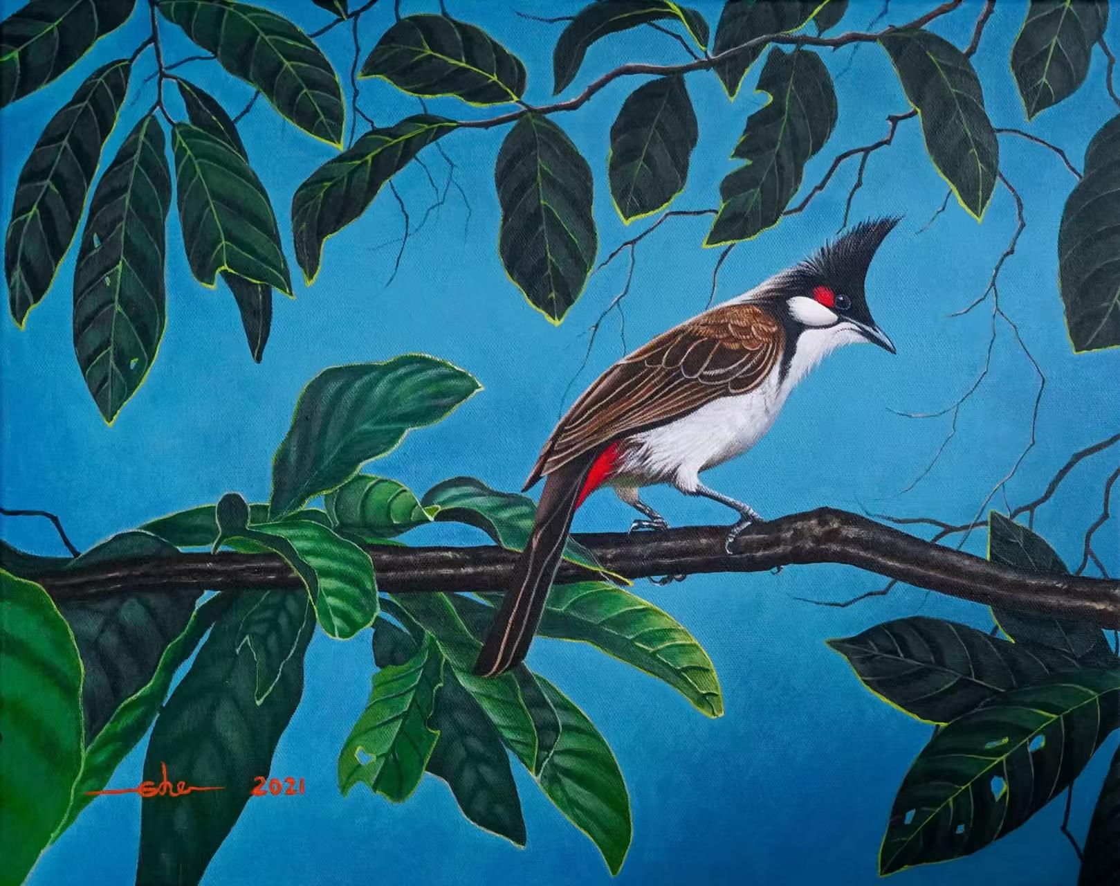 6. Stay Alive (Crested Bulbul) – Perched firmly among lush green leaves, the red-whiskered bulbul stands alert against a vivid blue sky — a quiet reminder that even in fragile moments, life endures with courage, awareness, and the will to survive.
