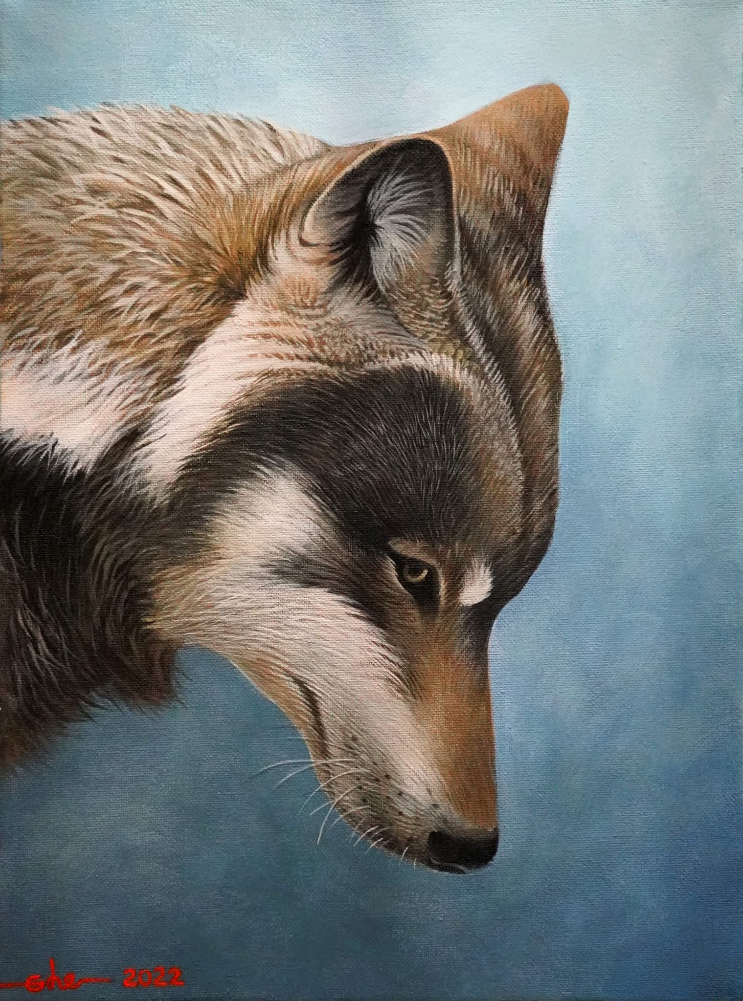 1. Fate (Wolf) — A detailed wolf portrait with a calm downward gaze, capturing a quiet sense of strength, mystery, and reflection.