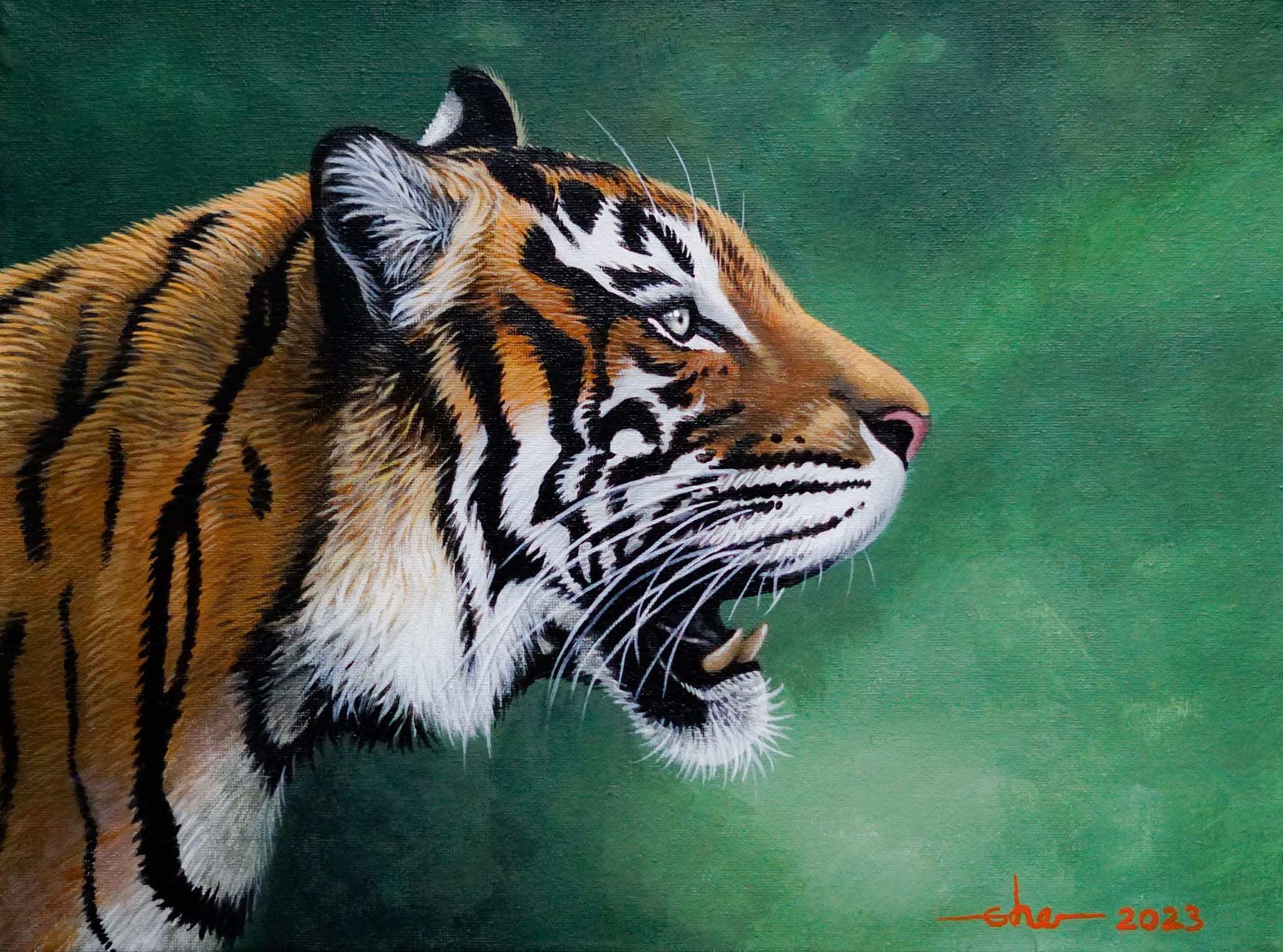 3. Howl of Lord with the Rise of Wind (Tiger) — A powerful tiger in profile with an open mouth and intense gaze, showing bold energy, strength, and wild majesty.