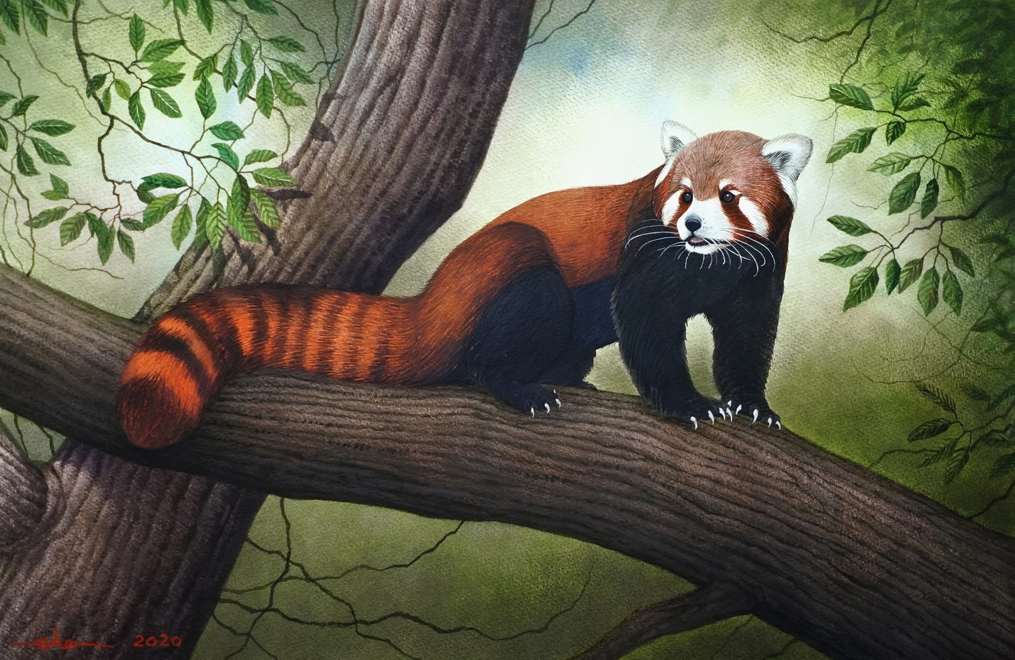 6. Red Panda — An adorable red panda perched on a tree branch, surrounded by soft greenery, capturing a playful and endearing woodland spirit.