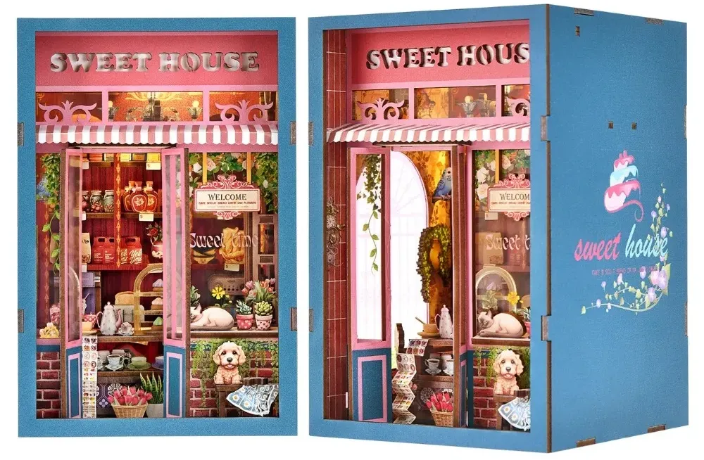 The Sweet House DIY Book Nook Kit is like sneaking a bakery right onto your bookshelf — minus the calories! Go inside and you’ll see a sleepy kitty, a happy pup, towers of cakes, and trays of tempting pastries that look almost too good to be miniature. With its candy-colored glow, striped awning, and shelves overflowing with sweetness, this little nook turns your books into neighbors with a cozy dessert shop. It’s playful, it’s whimsical, and it’s guaranteed to sprinkle a sugar-dusted smile across your reading adventures!