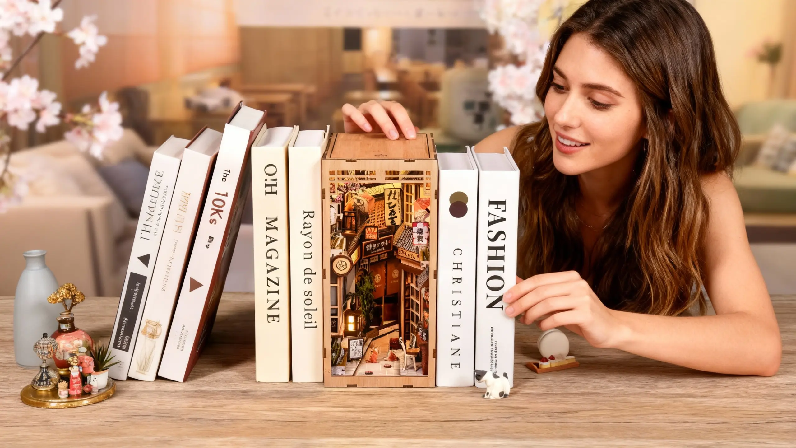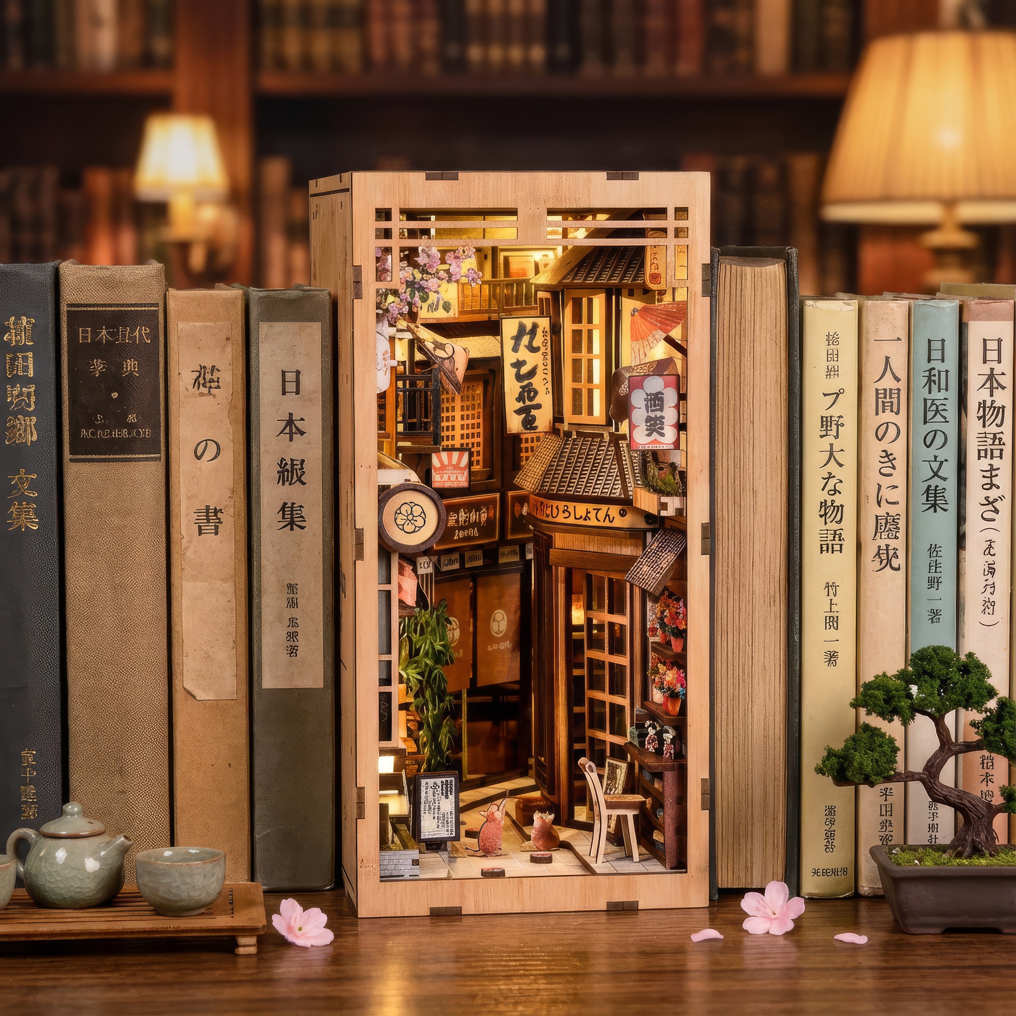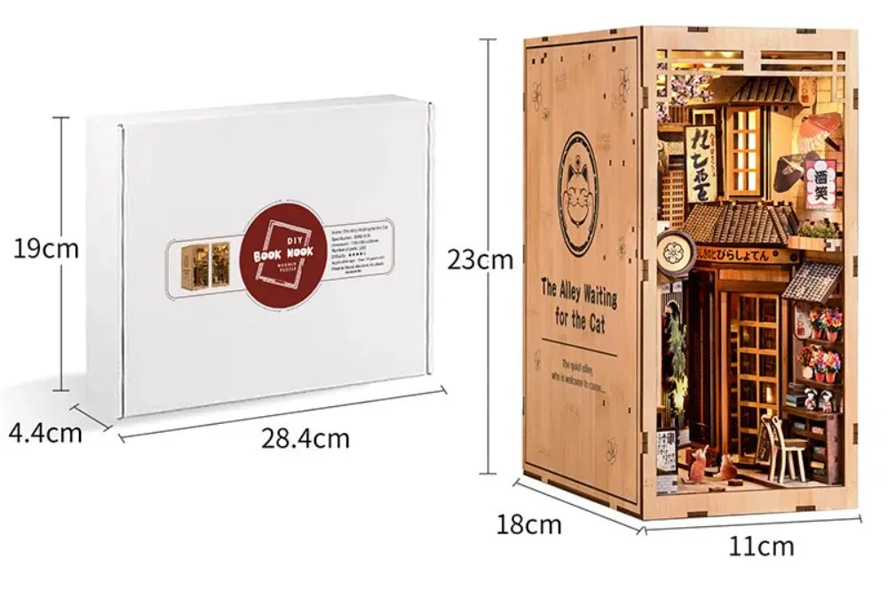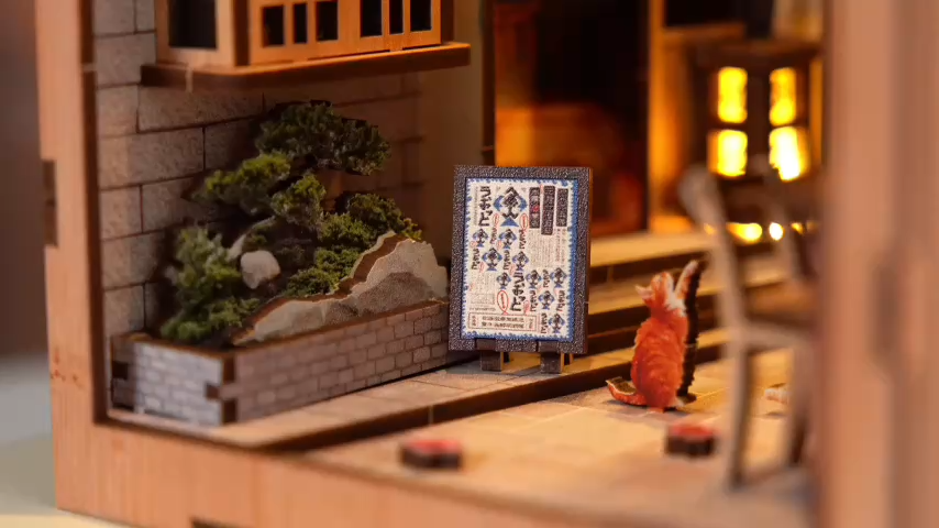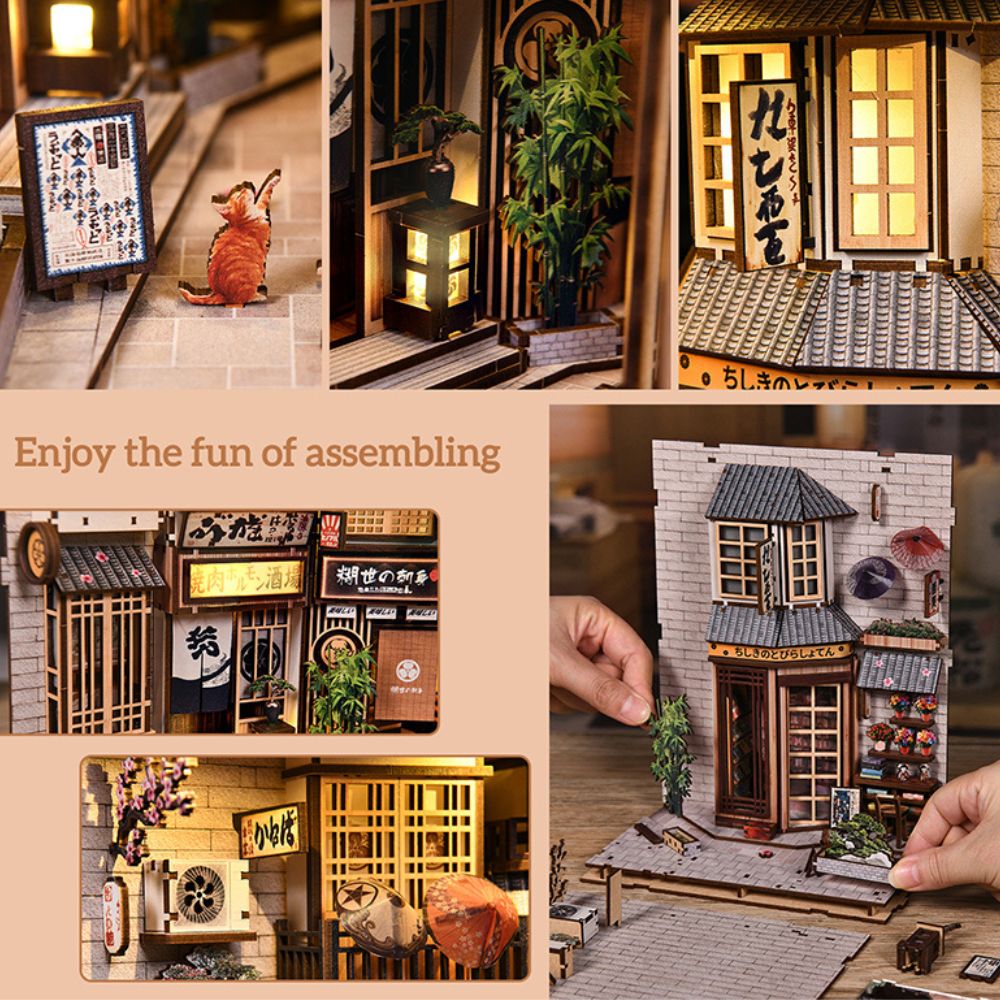 The Alley Waiting For The Cat DIY Book Nook Kit is an old Japanese street, where are time seems to slow down. With inside glowing lanterns, traditional shop signs, tiny potted flowers, and intricate wooden details, you can feels like stepping into a nostalgic neighborhood corner. The warm lights spill from the little bookstore and café, you can imagine stories unfolding inside while a cat might just wander in all times. Every details is from hanging umbrellas to vintage posters and lived-in atmosphere. You can Come and try it now!!