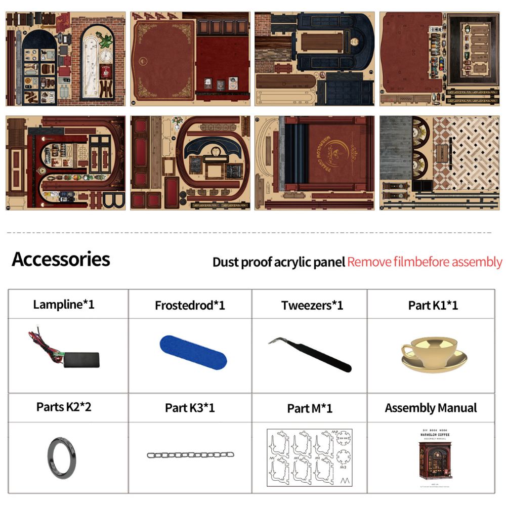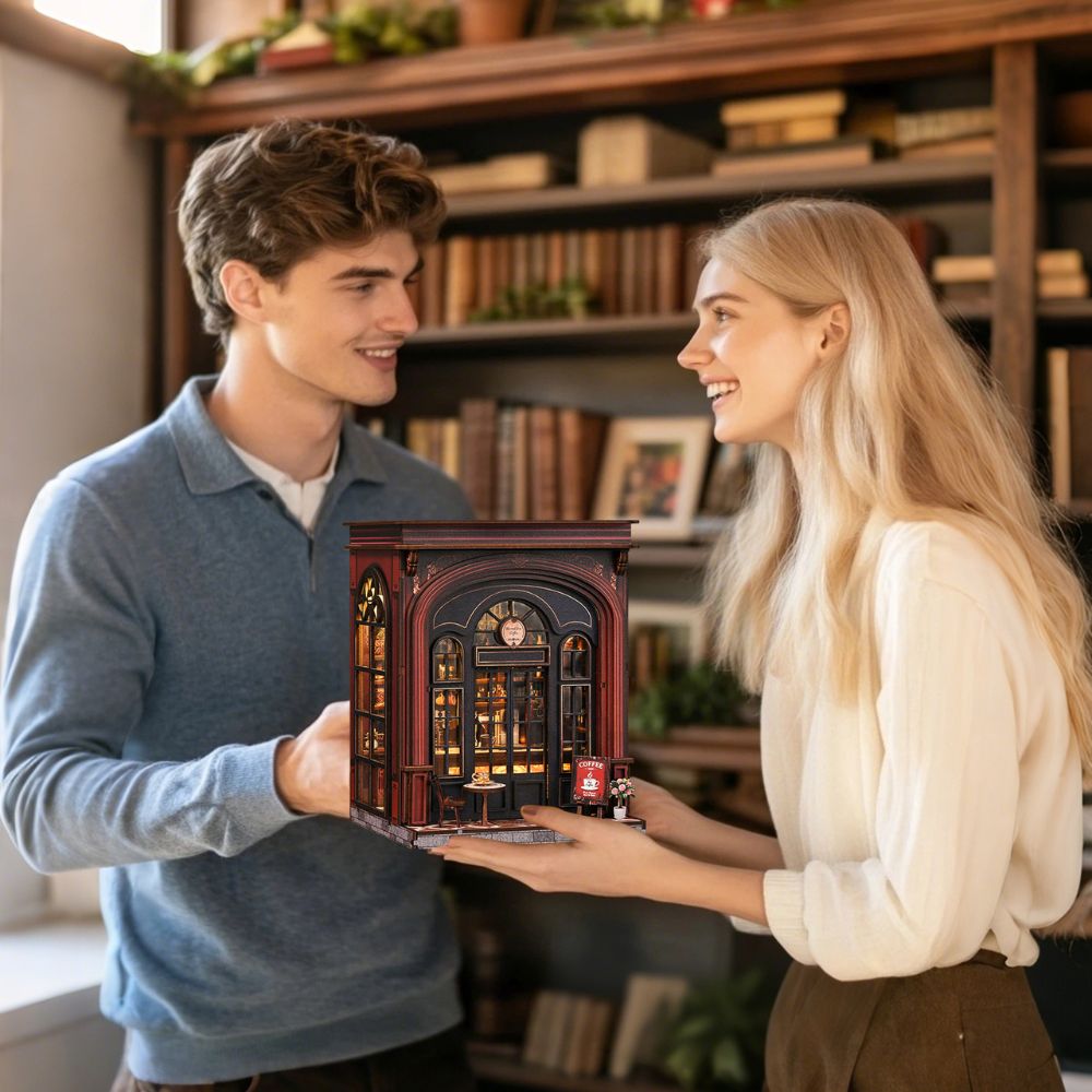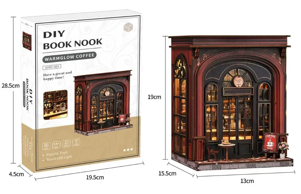 The Warmglow Coffee DIY Book Nook Kit invites you come in with a cozy, old-world café where golden lights glow softly over polished wood counters, delicate coffee cups, and richly detailed shelves filled with to beans, bottles, and espresso machines. With to designed with an elegant arched storefront and warm ambient lighting, this miniature scene captures the comforting charm of a quiet coffee shop tucked away on a European street. From the tiny bistro table by the window to the vintage coffee sign and chandelier above the bar, every detail feels welcoming and lived-in. Crafted from eco-friendly wood and brought to life with touch-activated lighting, this book nook transforms your bookshelf into a warm, relaxing retreat that celebrates slow moments and the simple joy of coffee.